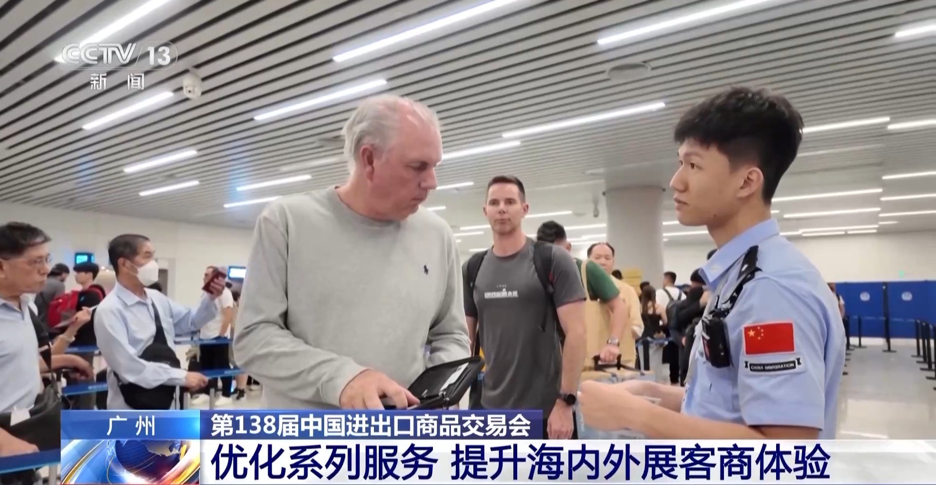 总台记者 吴美苗:这是白云机场的入口大厅。外国航班一落地进入入口大厅,白云边检站就为广交会设立了6条专用通道。同时成立了10余支外语服务团队,为有需要的外国旅客提供母语咨询、通关指导等服务。此外,我们还为广交会会员店设立了临时入境许可申请专属窗口,对符合过境免签条件的会员店提供“专人即时申请”服务,办理流程最短仅需5分钟。